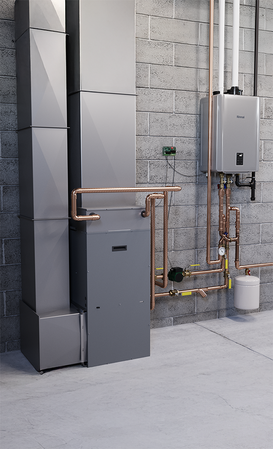 Combined with a Tankless Water Heater or Boiler and Hydronic Heating Coil sized by Rinnai, the Heat Pump Companion Kit converts an all-electric heat pump to a gas-powered heating appliance.